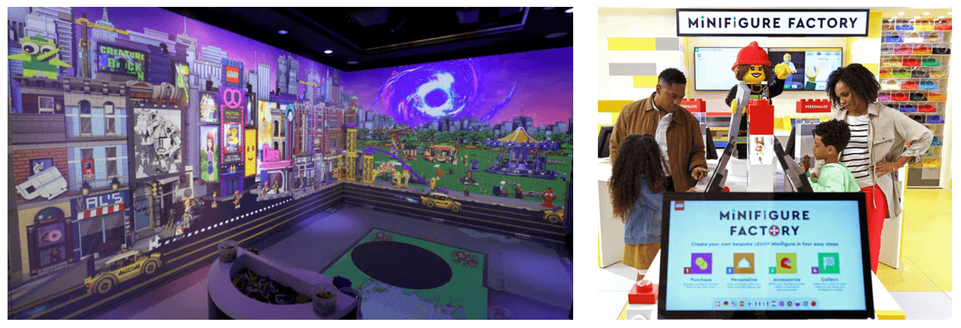 Their store features a bookable ‘Brick Lab’ where customers can scan their Lego creations to see them appear in the digital world on the lab’s screen-covered walls. Accompanying the lab is a ‘Minifigure Factory’ that allows Lego fans to become consumer-creators by letting them design a unique Lego figure on-screen and print it.