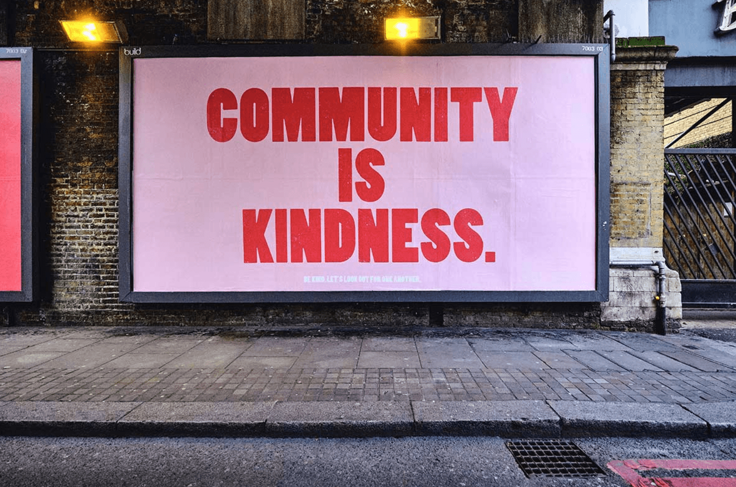 ‘Community is kindness’ billboards appeared around Loughborough Junction in Brixton, created by out-of-home agency Jack Arts. The campaign was put out as a positive gesture by the team and appeared across 10 cities in the UK and then picked up in the media before landing across the world in Australia, New Zealand, Canada and USA. The posters were also made downloadable to print at home and put in windows to keep spirits high.