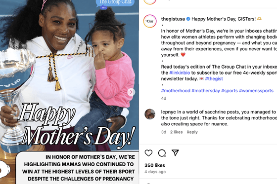 Canadian platform, The Gist, is leading the charge. As a female founded company they promote equal gender coverage, as well as creating tailored content to support women, with articles such as ‘how elite athletes perform during pregnancy’. Cosmopolitan is also breaking ground, showcasing athletes like superstar basketball player A’ja Wilson discussing the everyday and the athlete life.