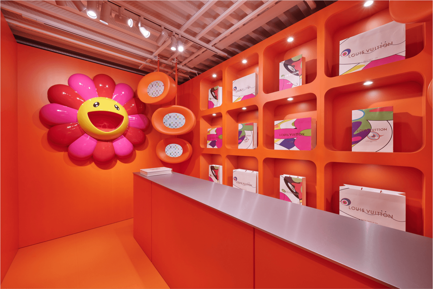 Louis Vuitton takes a different approach to colour, instead associating with the whole spectrum, emphasised under Virgil Abloh’s creative direction. In 2022, the exterior of Vuitton’s Bond Street store was transformed into a colourful explosion, creating a moment amongst the grey of London. This same approach has been seen in their pop-up’s, notably their collaboration with Murakami which utilized an orange monochromatic centre point.