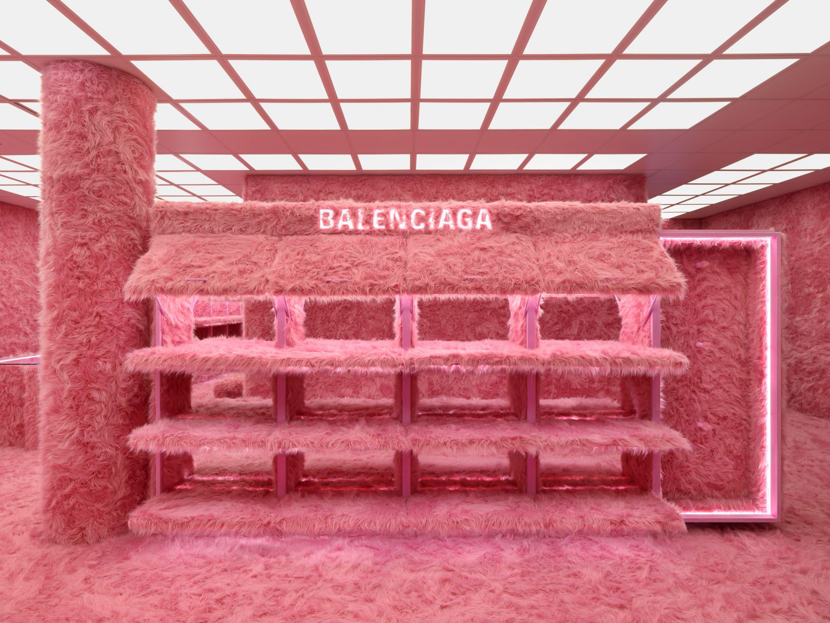 Balenciaga are commonly known for their black monochromatic aesthetic however they’re definitely not scared to get a bit weird, especially when it comes to their pop ups. 2022 saw their LeCagole bag pop-up, an entire room of pink fluffy fabric, from the shelves to the floor, a deep contrast to the plain black.