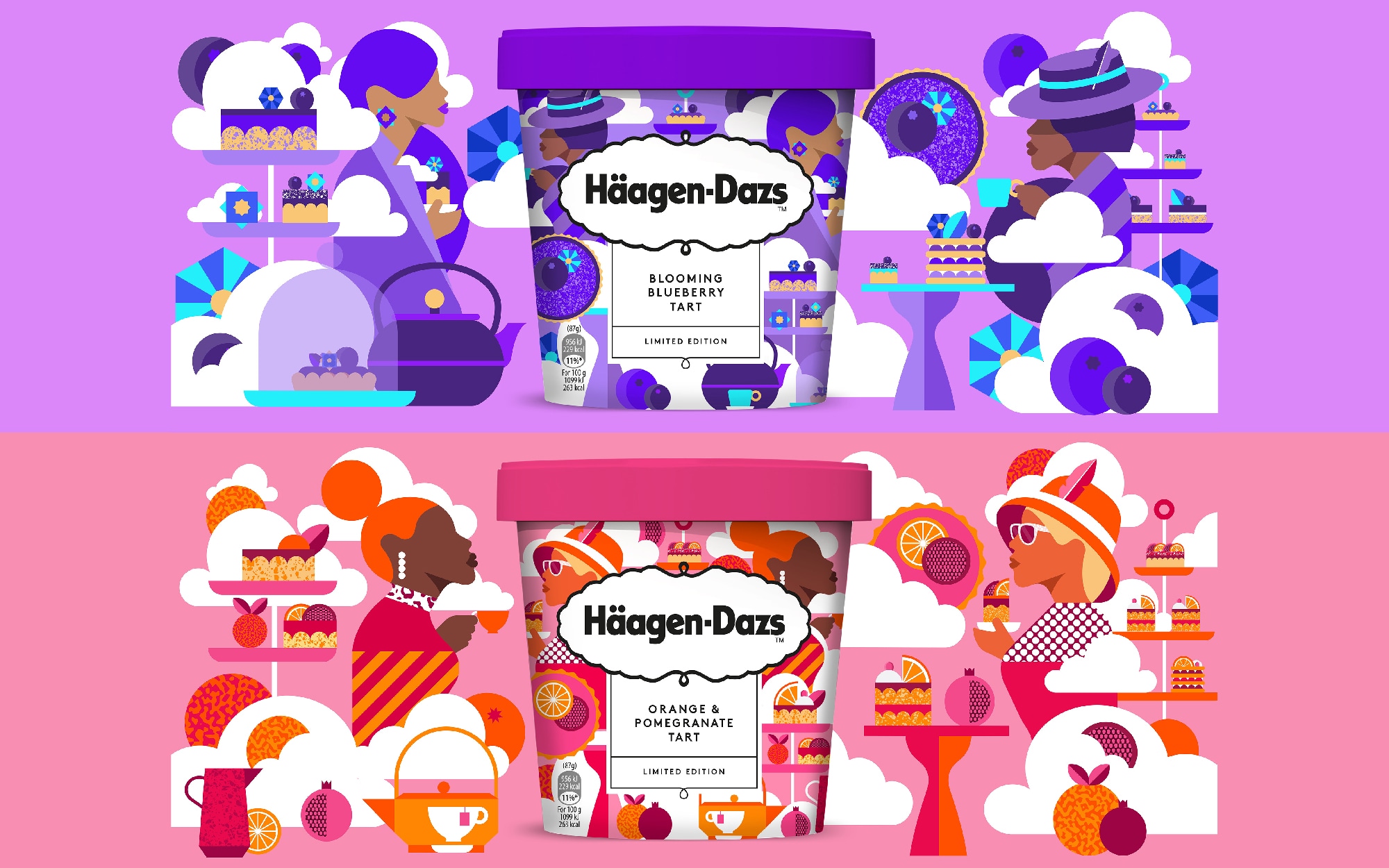 Inspired by afternoon tea desserts, Haagen-Dazs launched two new flavours for Spring: ‘Blooming Blueberry Tart’ and ‘Orange & Pomegranate’ featuring beautifully crafted illustrations by Eynon Jones. Despite the traditional connotations of afternoon tea, Jones brings a visually interesting twist by creating playful scenes with individually crafted elements. Paired with his use of bold, striking colours this creates high impact to vividly represent the flavours. Jones’ simple yet effective flat lay illustration style adds a unique and elegant touch, transporting customers to the delightful occasion of afternoon tea through illustrations bursting with flavour and style.