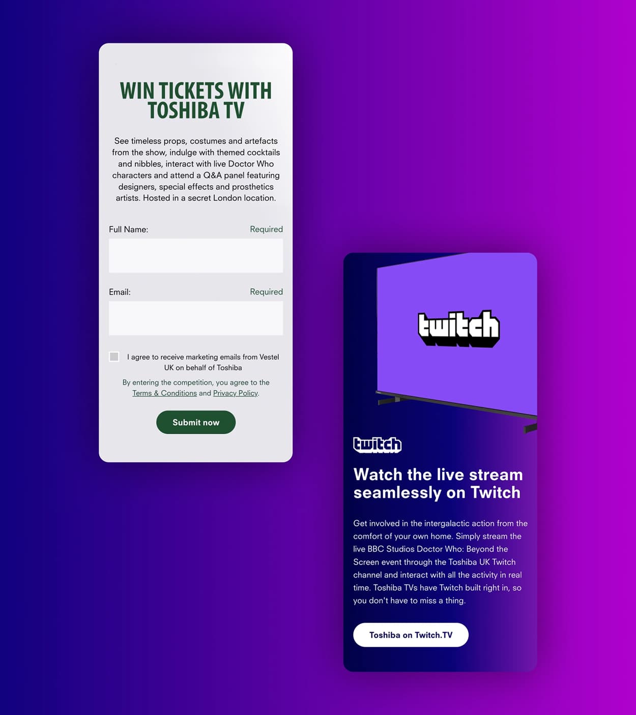 An exclusive Doctor Who fan event was produced by Toshiba in conjunction with The One Off featuring never before-seen props, immersive experiences, a live streaming of the final Doctor Who special episode, and broadcasted a panel Q&A live on Twitch for tens of thousands of avid fans to enjoy from home.