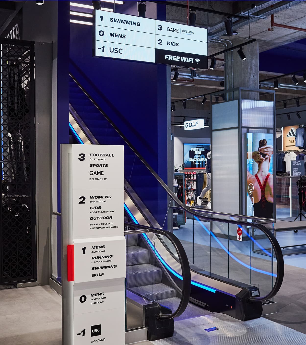 Alongside our creation of Sports Direct’s flagship stores, we designed and developed a digital wayfinding solution to drive shoppers through the store and highlight the services and shop-in-shops inside. As the Sports Direct Birmingham store is 60,000 square feet and has 4 floors, it was imperative that navigating around the store was made as easy as possible for customers.