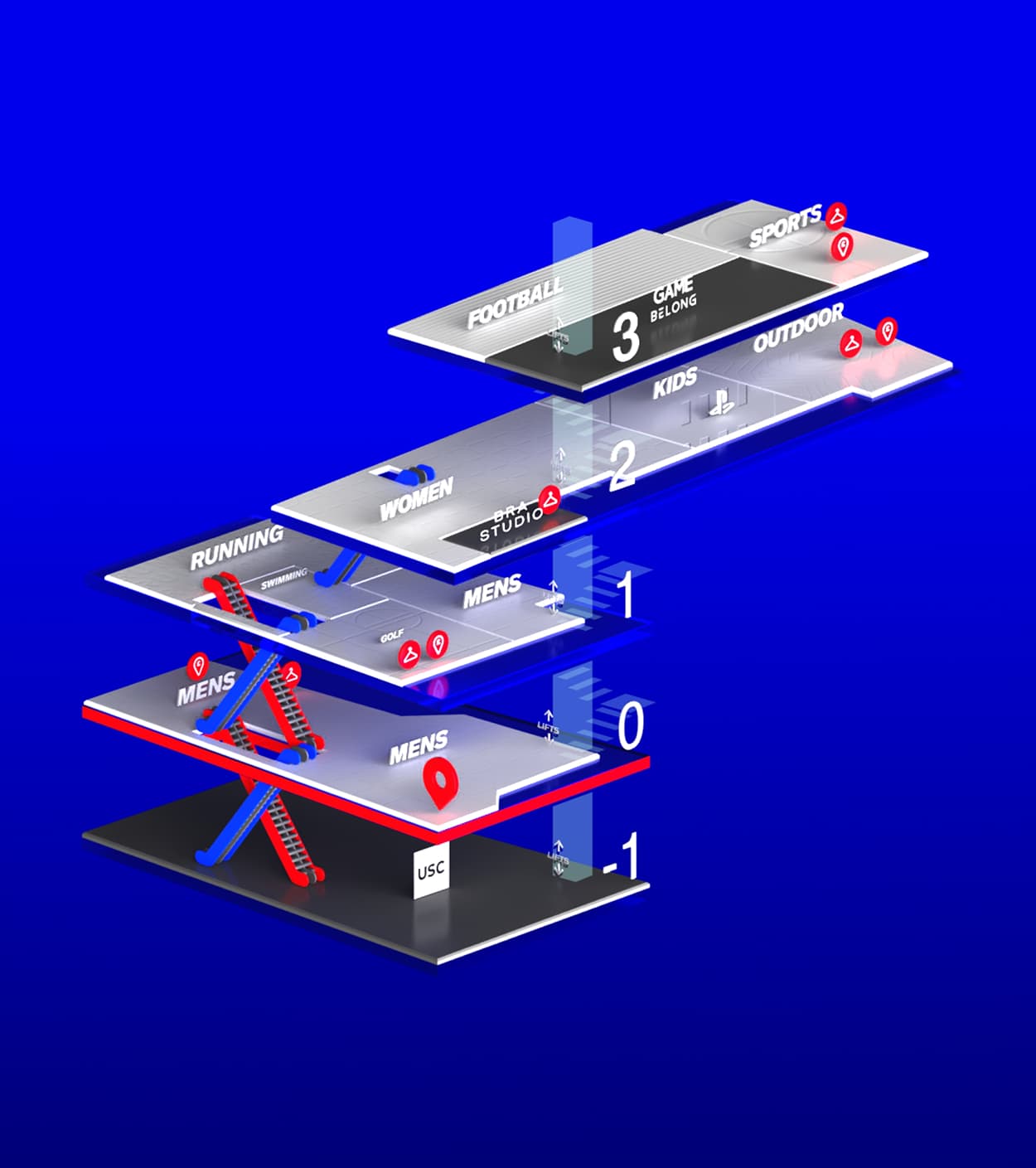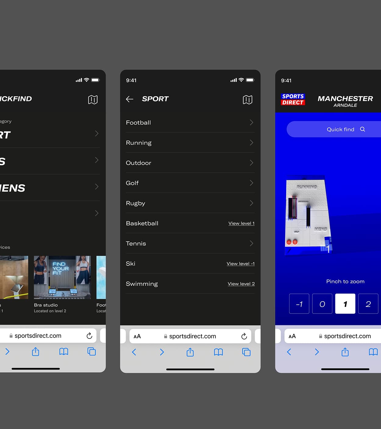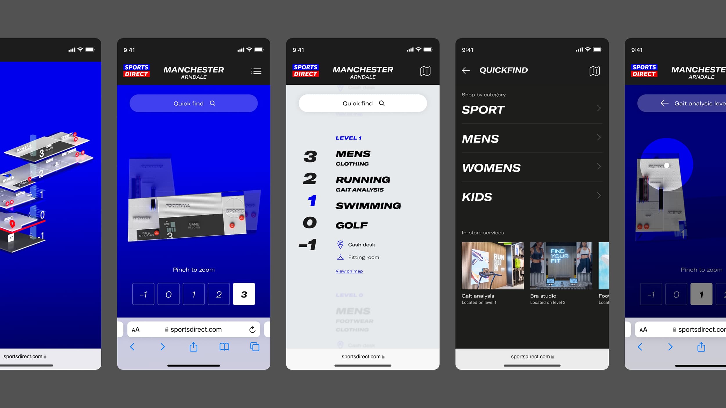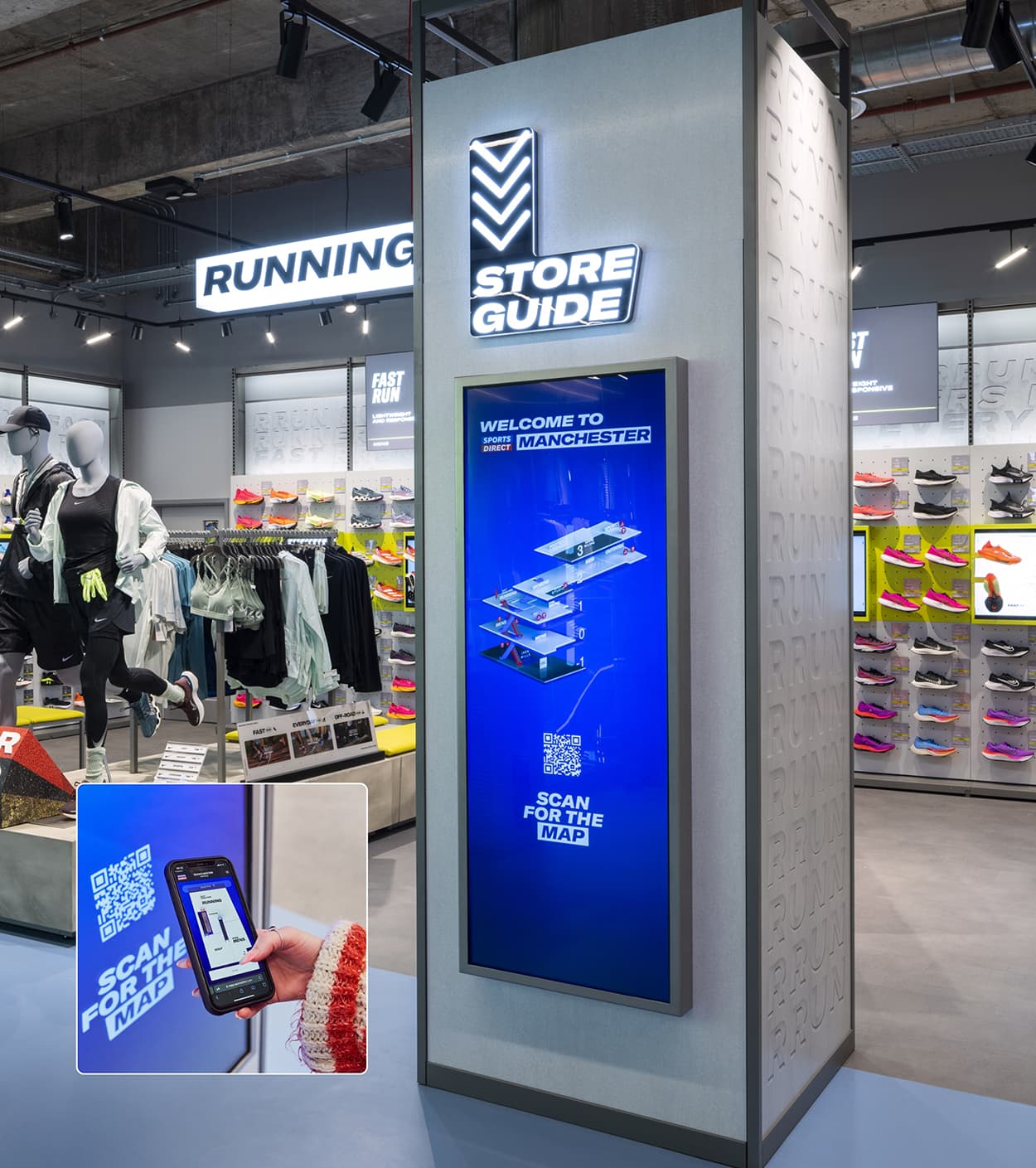 We developed a digital wayfinding system for Sports Direct’s flagship stores, combining large-format 3D maps and a QR-enabled web app to simplify navigation and enhance the in-store shopping experience.