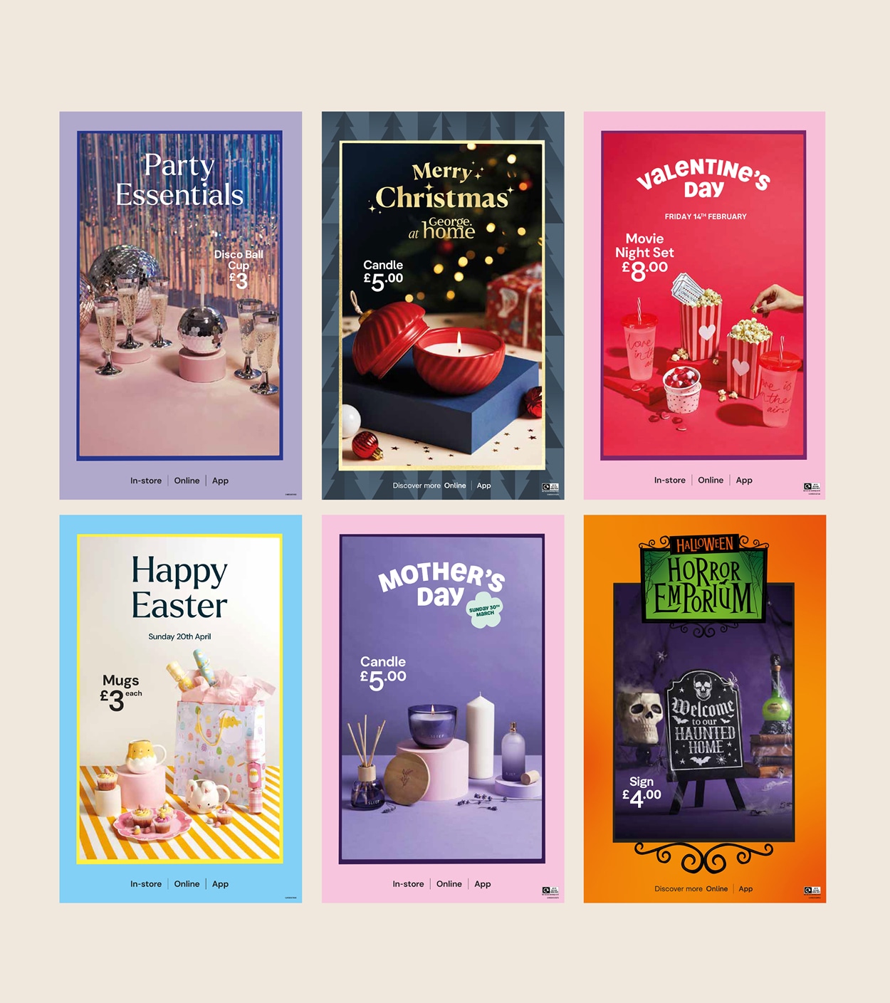 For over 15 years, we’ve partnered with George to design and deliver retail graphics across photography, art direction, in‑store point-of-sale, wayfinding, and packaging, helping the brand stay ahead of fast‑moving trends and evolving product ranges. Through seasonal campaigns, shop‑in‑shop displays, and impactful in‑store messaging, we ensure customers receive the right communication at the right moment, creating a more engaging and seamless shopping experience.